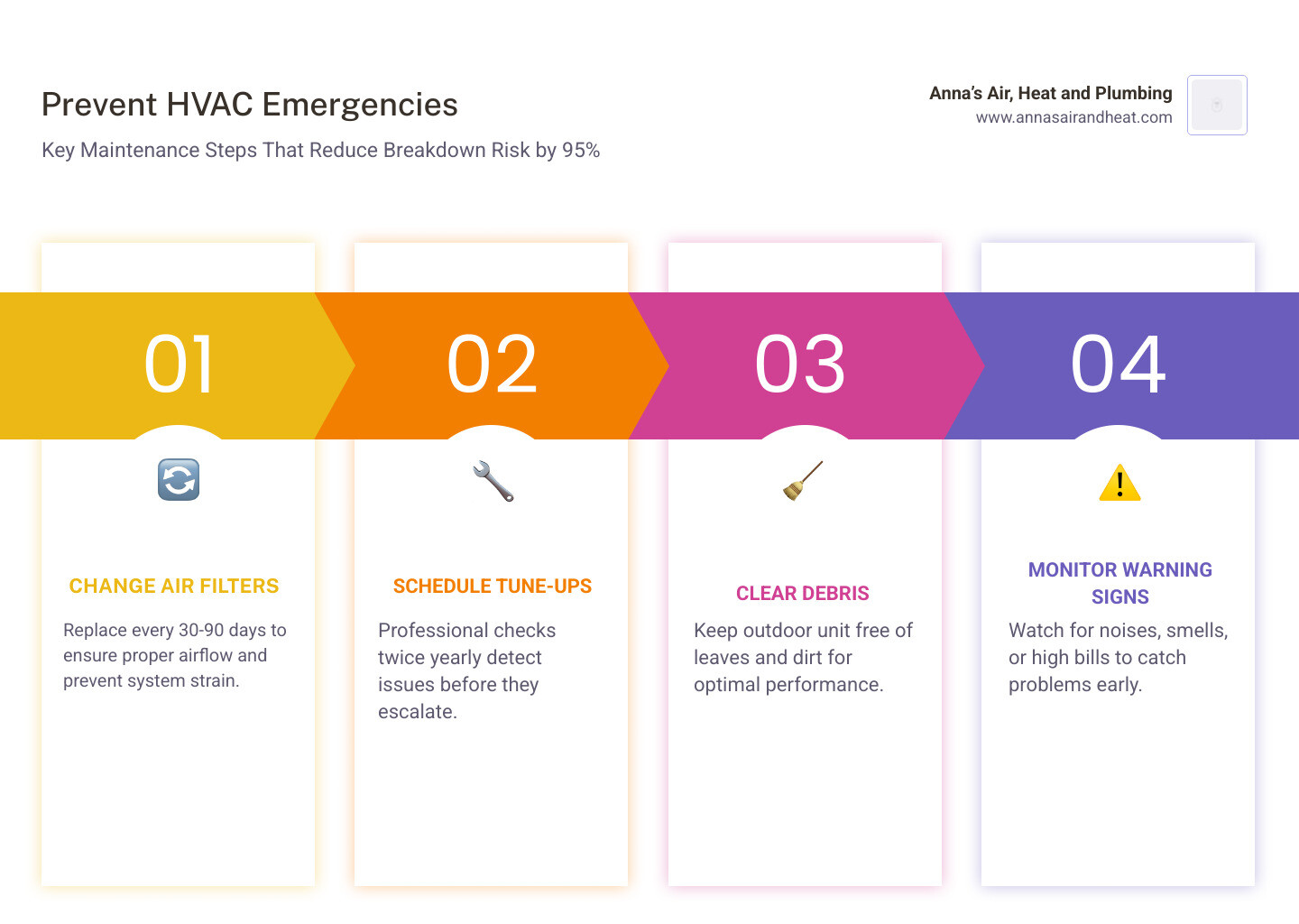 To prevent HVAC emergencies with maintenance, follow these key steps: